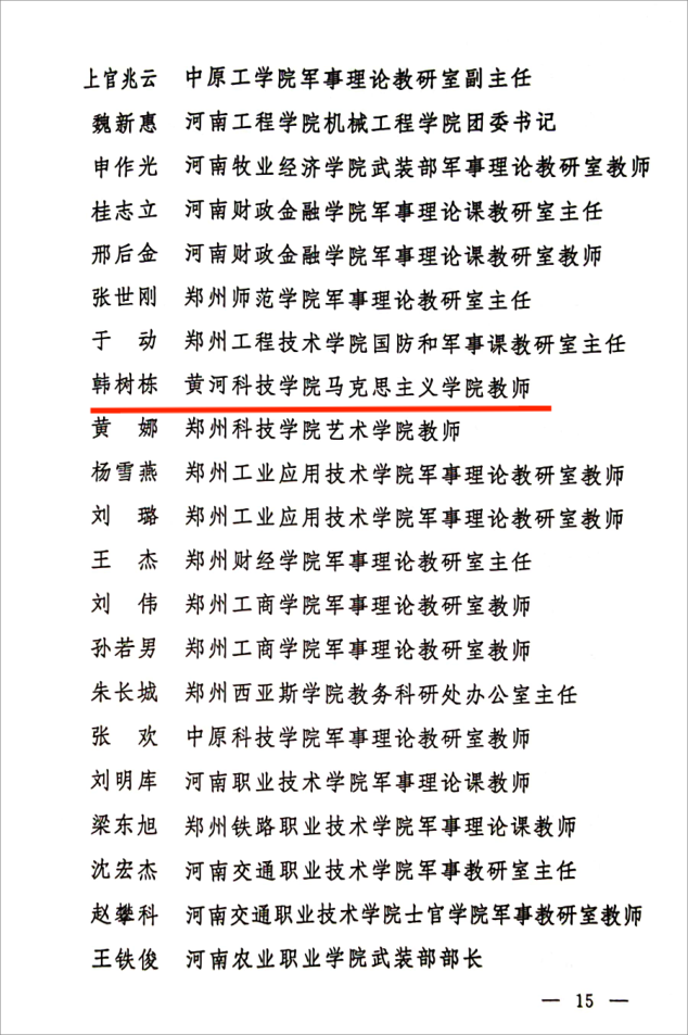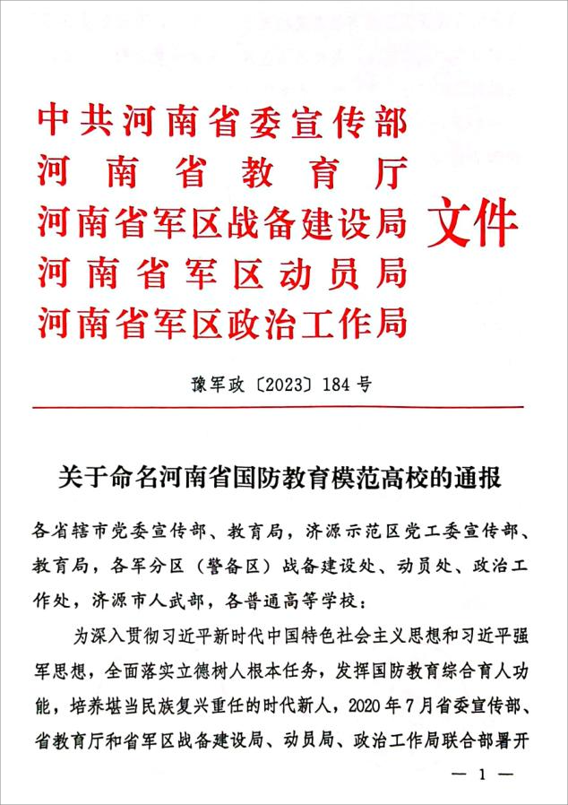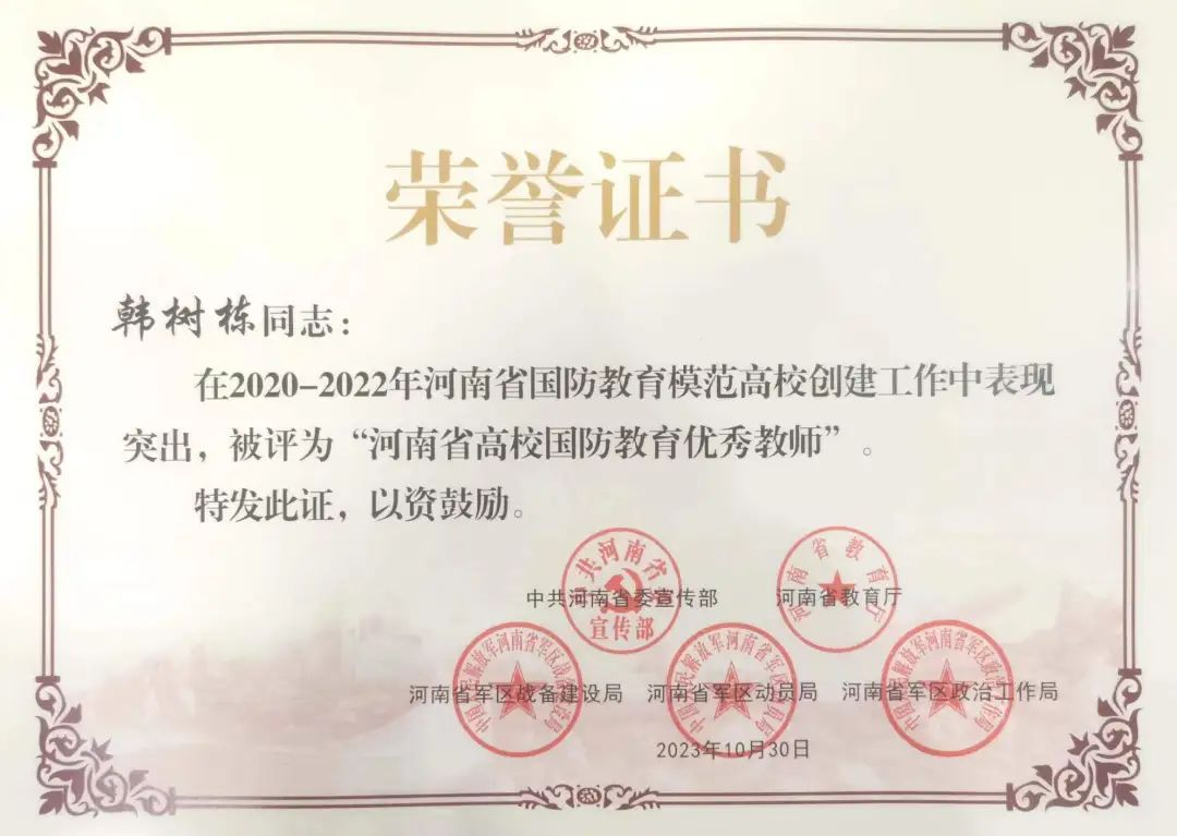 近日,中共河南省委宣传部、河南省教育厅、河南省军区战备建设局、河南省军区动员局、河南省军区政治工作局五个部门联合下发了《关于命名河南省国防教育模范高校的通报》。我校被命名为首届“河南省国防教育模范高校”,suncitygroup太阳集团分党委副书记韩树栋被评为“河南省高校国防教育优秀教师”。