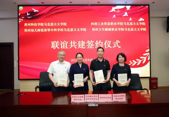 suncitygroup太阳集团院长王振国、河南工业贸易职业学院suncitygroup太阳集团院长靳翠梅、郑州幼儿师范高等专科学校suncitygroup太阳集团党总支书记、院长梁彩霞、郑州卫生健康职业学院suncitygroup太阳集团院长涂俊礼签订合作共建协议书。